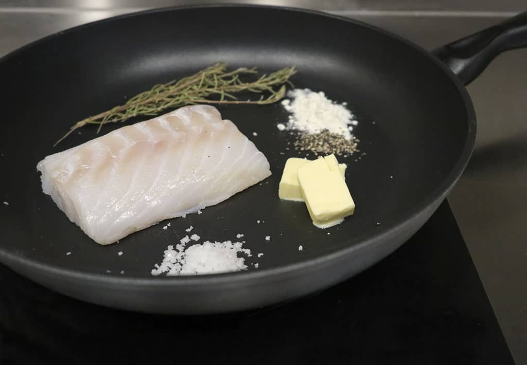 Om de perfecte kabeljauw te bakken heb je nodig: kabeljauw, zout, peper, bloem, boter en rozemarijn.