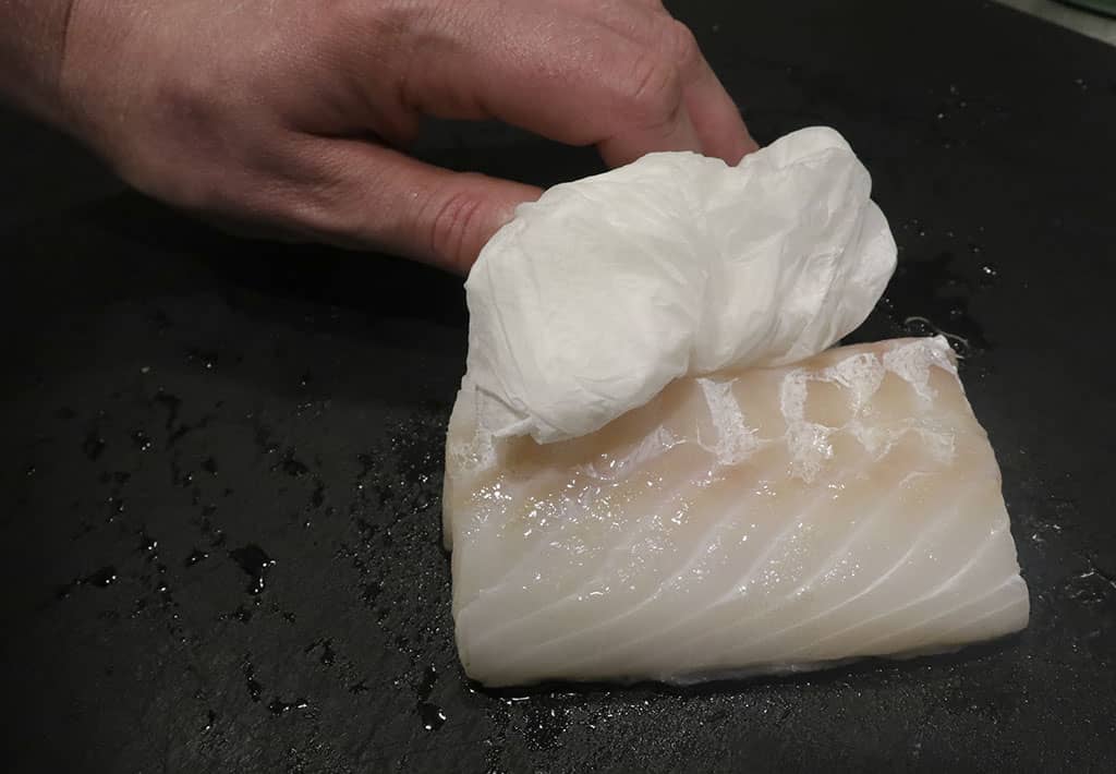 Dep de kabeljauw goed droog en kruid met peper en zout naar keuze.