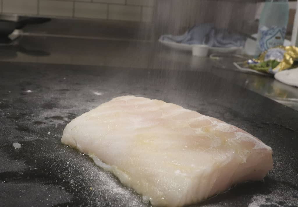 Doe wat bloem in een zeef en bestrooi vervolgens de kabeljauw aan beide kanten.