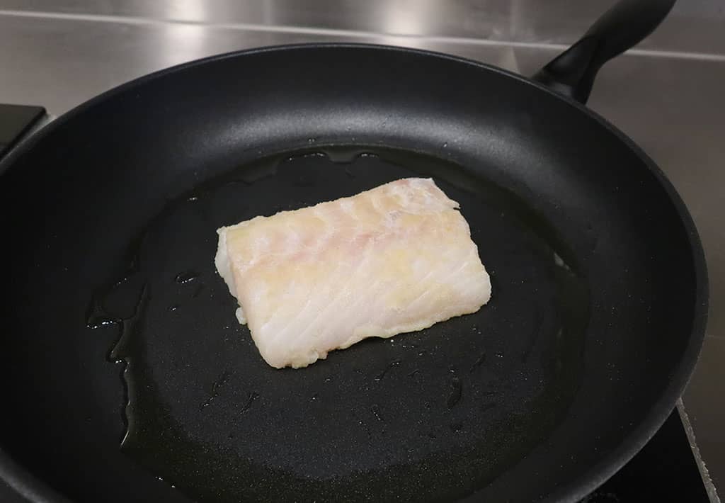 Zet je (anti-aanbak)pan op middelhoog vuur en verwarm wat olie. Leg de kabeljauw in de pan en bak 3-4 minuten. Voeg na 3-4 minuten wat rozemarijn toe.