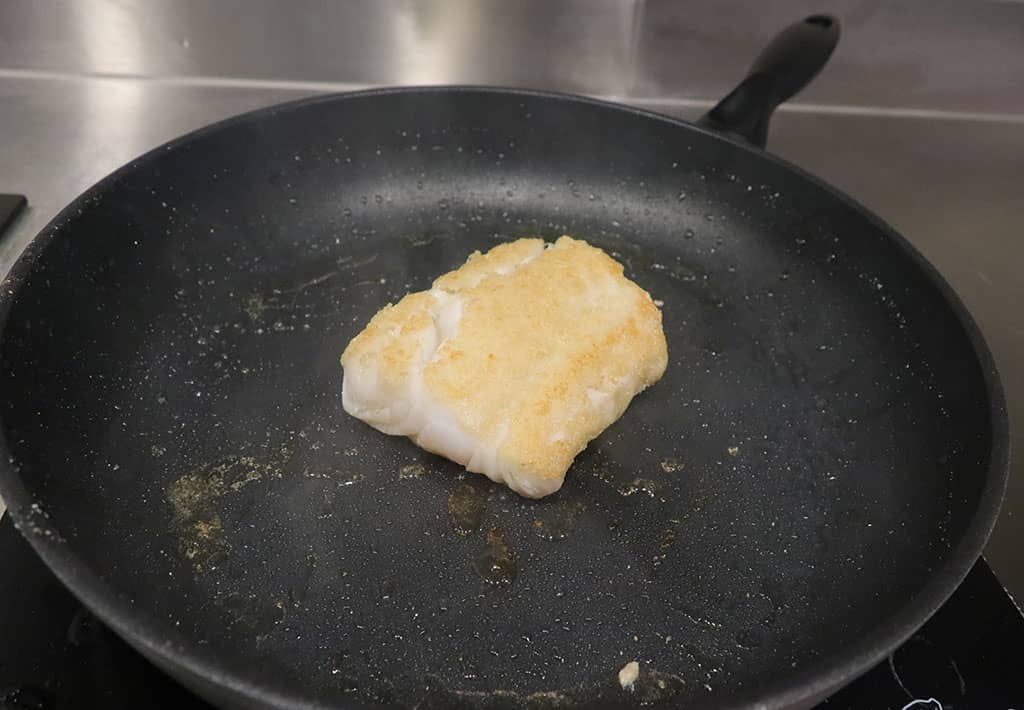 Draai dan de kabeljauw om en bak nogmaals 3-4 minuten aan de andere kant. Doe een klontje boter in de pan en besprenkel met wat citroensap. Laat de boter niet aanbranden maar smelten op wat lager vuur.