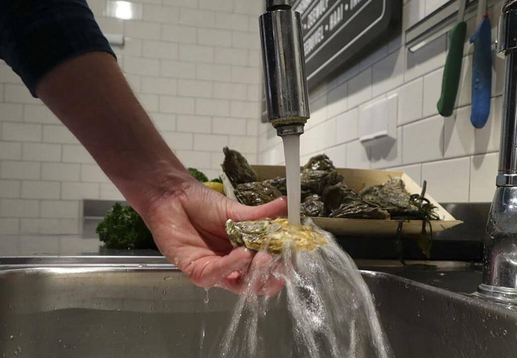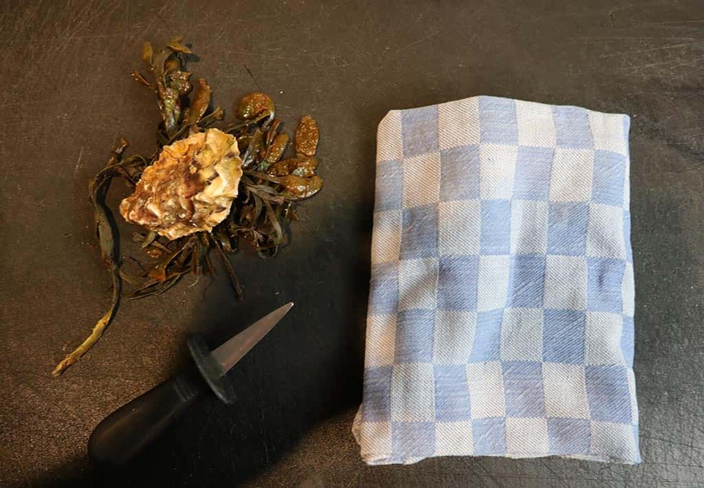 Voor het serveren kun je de losse oester nog even omdraaien in zijn eigen sap in de schelp, om de oester nog lekkerder te laten smaken.