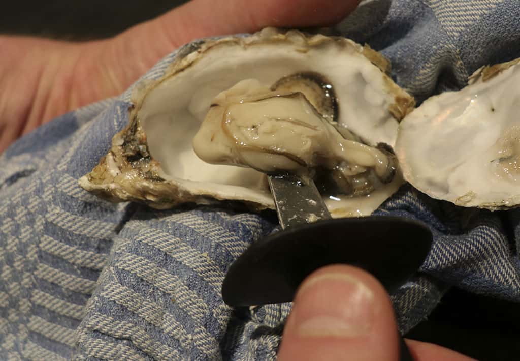 Oesters maak je open met de bolle kant naar beneden, omdat de oester water bevat. Houd de oester dus het liefst horizontaal de gehele tijd bij het oesters openen. De truc is om de oester voorzichtig op te maken, zodat de schelp geheel in tact blijft. Dit kan best even duren, maar uiteindelijk zul je merken dat de bovenste helft gaat meegeven. Zodra je voelt dat de bovenste schelp loskomt, kun je je mes naar het midden van de oester verplaatsen. Dit is het punt waar de oester bevestigd is aan de bovenste schelphelft door middel van een spier. Wanneer je deze hebt losgesneden kun je de schelphelften van elkaar verwijderen.