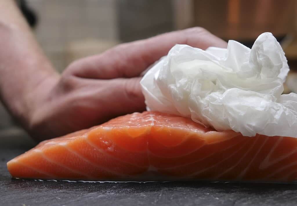 Dep de zalm goed droog. Gebruik keukenpapier om overtollig vocht te verwijderen, dit helpt bij het verkrijgen van een krokante huid.