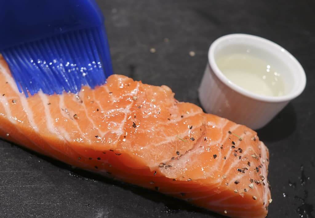 Smeer de zalm in met een beetje olie. Voeg ook een snufje zout en peper toe voor een betere smaak.