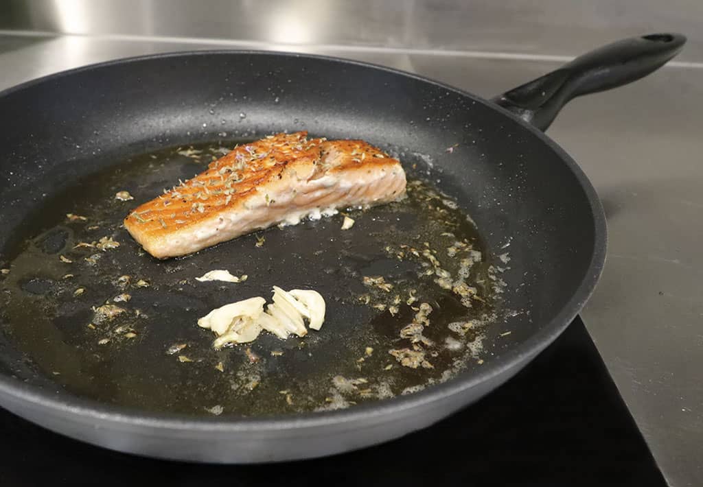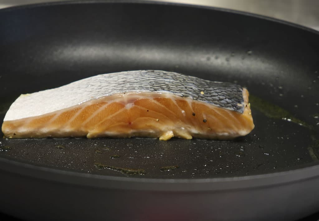 Leg de zalm met de huid naar boven in de pan en verwarm tot de zalm zo’n ⅔ van zijn kleur heeft gekregen (zo’n 3-4 minuten) en iets knapperig is. Laat de zalm ook echt 3-4 minuten stilliggen in de pan om een mooie krokante huid te krijgen. Je raakt de zalm maar 1 keer aan als je hem omdraait ;-).