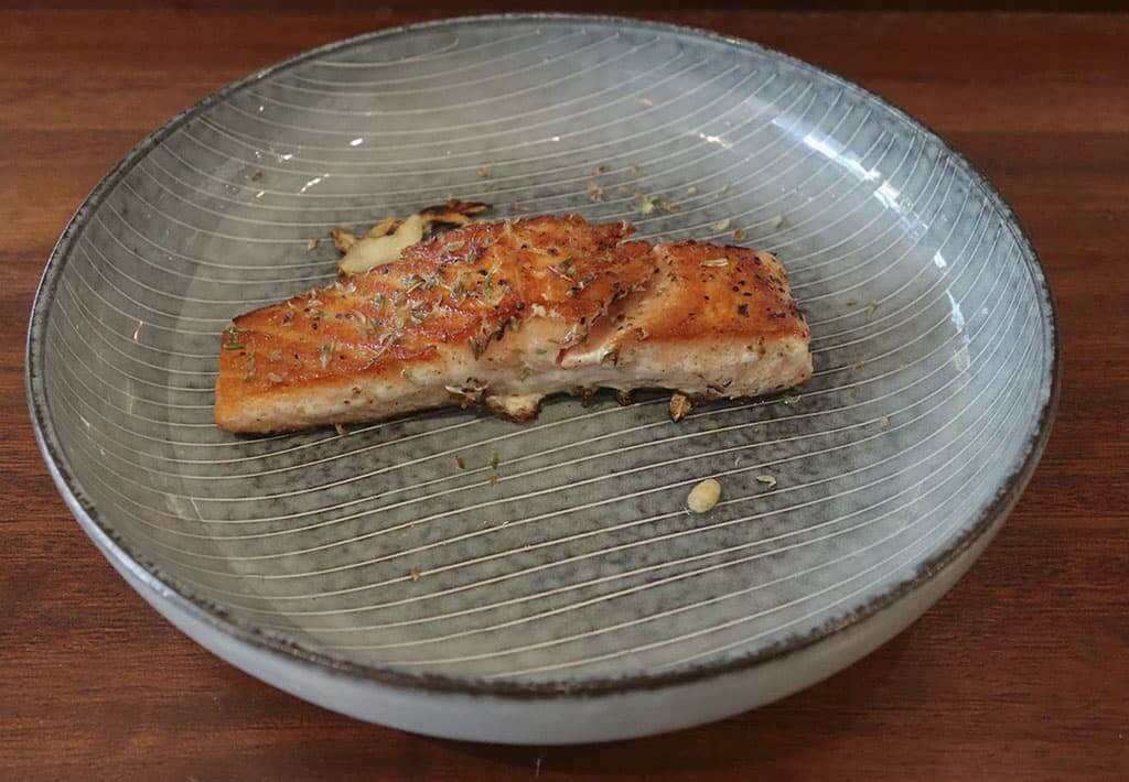 Pak de zalm met een tang uit je pan en leg deze op een bord, giet eventueel de warme boter over de zalm heen. Laat de zalm even rusten voordat je deze afgarneert met gedroogde thym of verse dille.