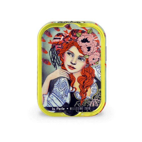 Sardines in olijfolie 2016, Miss Perle, 115 g. Beperkte oplage, naar schilderij van Delphine Cossais.